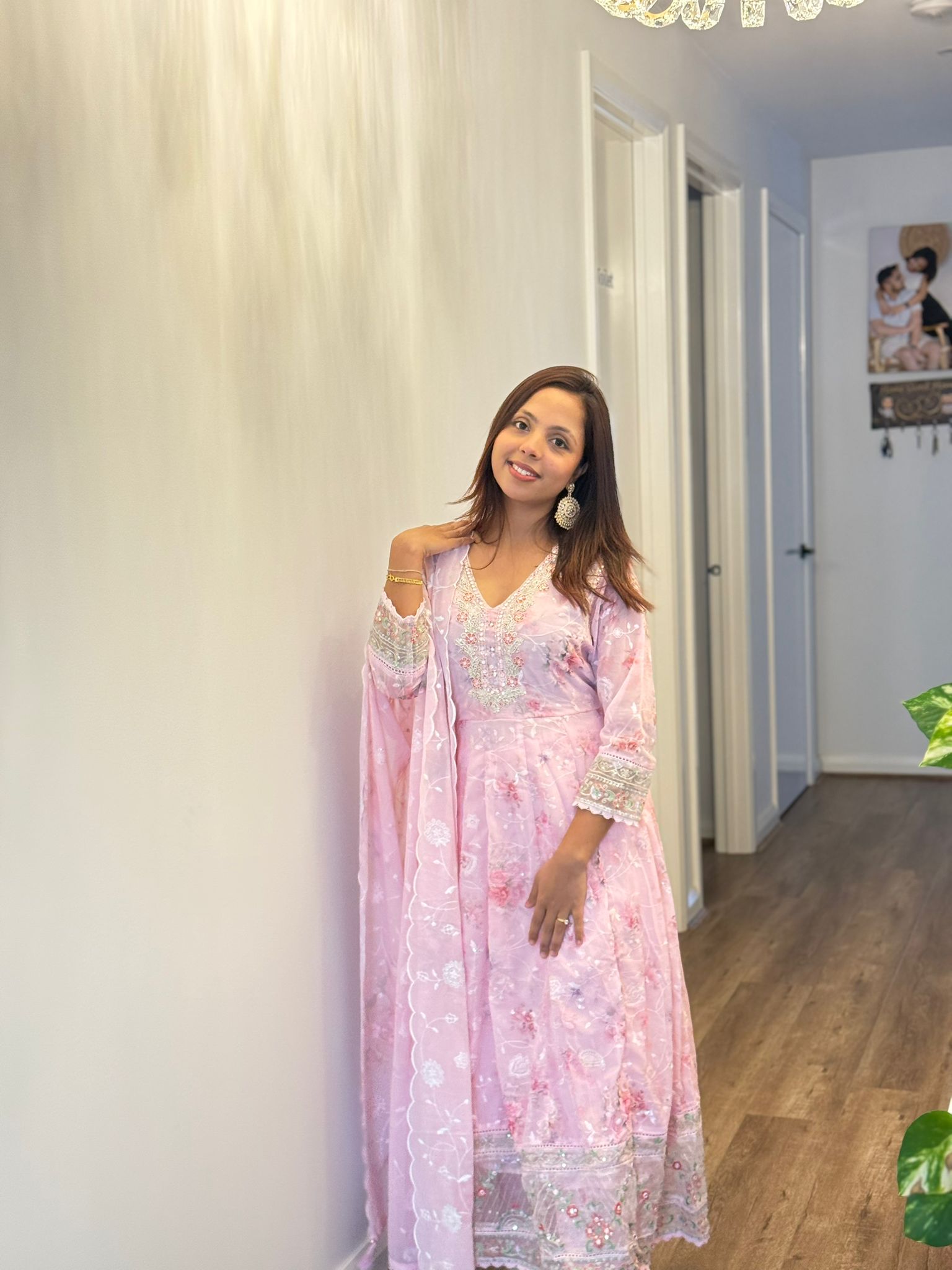 Step into elegance with this pastel pink embroidered Anarkali suit, a perfect blend of grace and charm. Designed with intricate thread and sequin work, this long flowy dress comes with a sheer net dupatta featuring floral embroidery and scalloped edges. The subtle color and detailed embellishments make it ideal for special occasions like weddings, festivals, or parties.